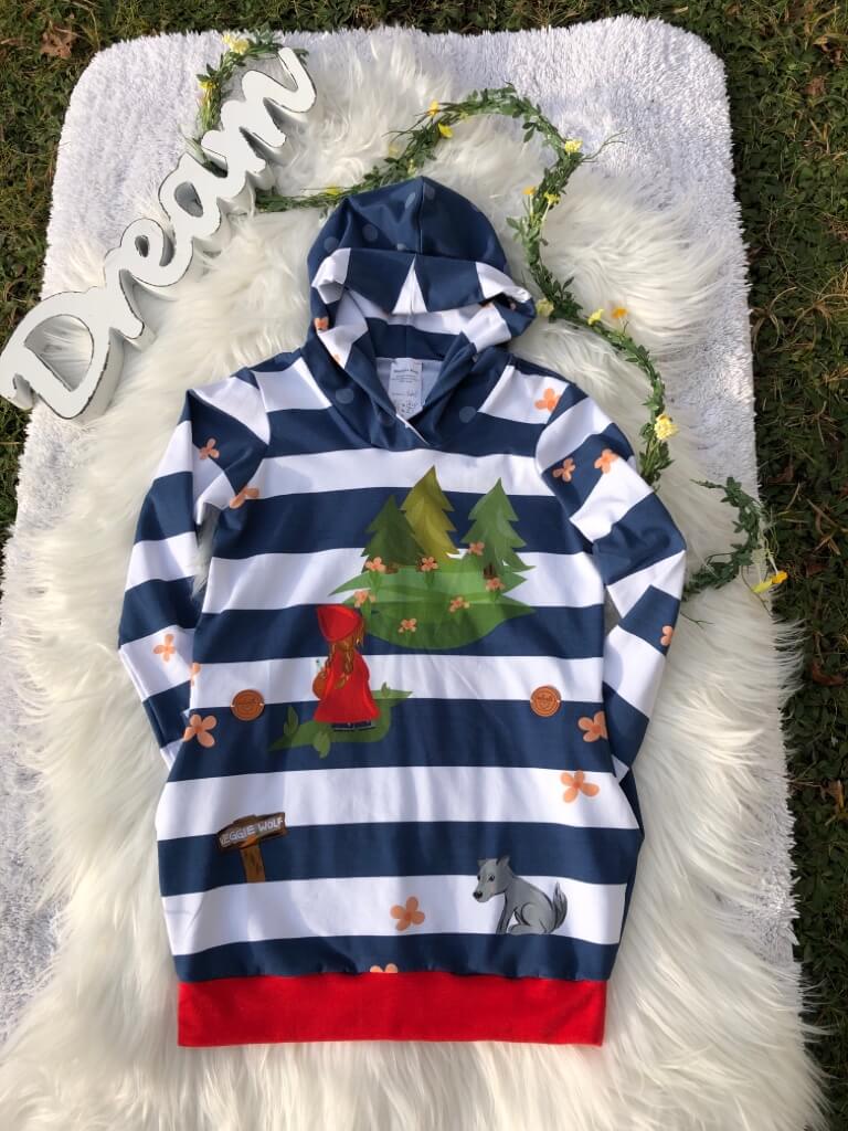 Dieses Hoodiekleid hat alles was sich Mädels wünschen können. Es ist super bequem, hat seitliche Taschen und eine Kapuze. Das Material besteht aus 95% Baumwolle, 5% Elasthan. Das rote Bündchen hat die gleiche Qualität. Aber der Hingucker sind die blau/weißen Blockstreifen am Vorderteil mit den zauberhaften Motiven. Rotkäppchen mal etwas anders. Das Rückenteil mit stilistischen Blüten  ziert ein großes Bild vom "Rotkäppchen". Der Veggie Wolf darf natürlich auch nicht fehlen.